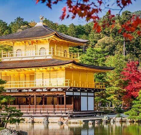 Templo zen cubierto en pan de oro, reflejado en un estanque que encarna la belleza serena de Kioto.