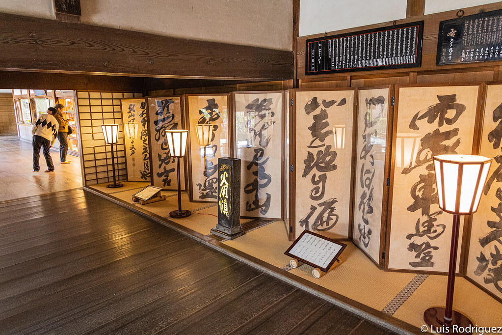 En la entrada, verás una exposición de caligrafías en papel japonés washi, así como otros objetos relacionados. Y también el antiguo altar que había en los aposentos del monje. Al lado tienes la tienda del templo, donde puedes conseguir tus amuletos o hacerte con una caligrafía goshuin.
